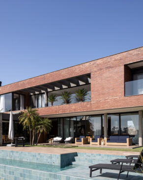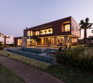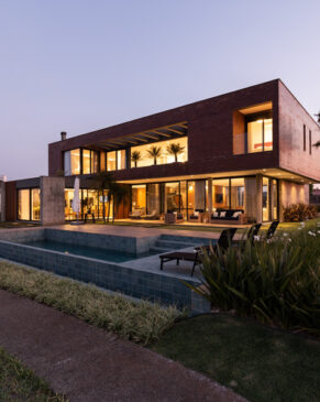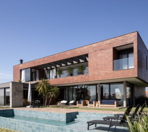 O fechamento da casa no térreo acontece por meio de planos de vidro, mantendo a transparência e a relação interior e exterior, resultando em um espaço interior fluido, acolhedor e dinâmico, inundado de luz natural.